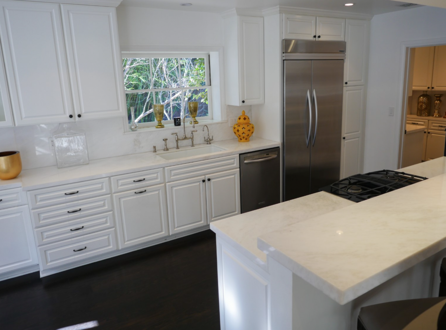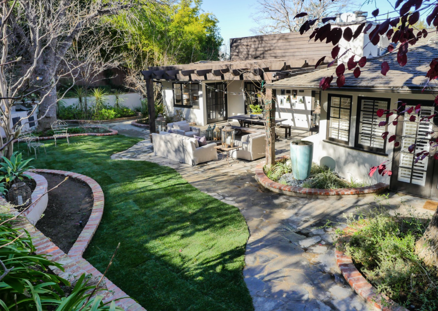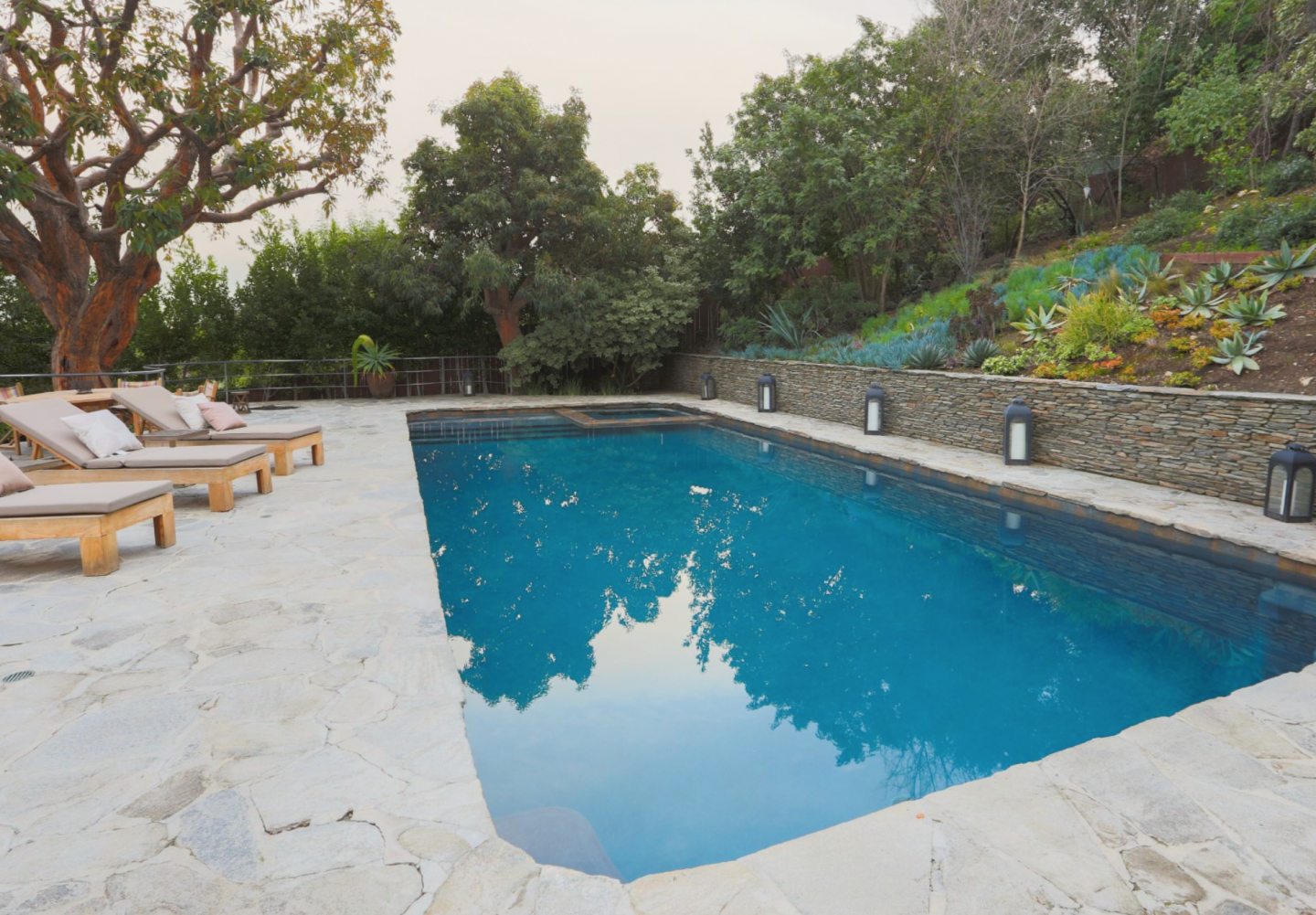 Meester, who left New York City to purchase the Los Angeles-area home, extensively remodeled the secluded residence to deliver the ultimate California indoor-outdoor lifestyle experience. The 2,847-square-foot “entertainer’s paradise” offers a lush gardens, a private, tiered backyard with saltwater pool, treetop views, a deck, a patio, a separate pool house with shower and changing room, a built-in barbecue, speakers, a bar, and a fridge.