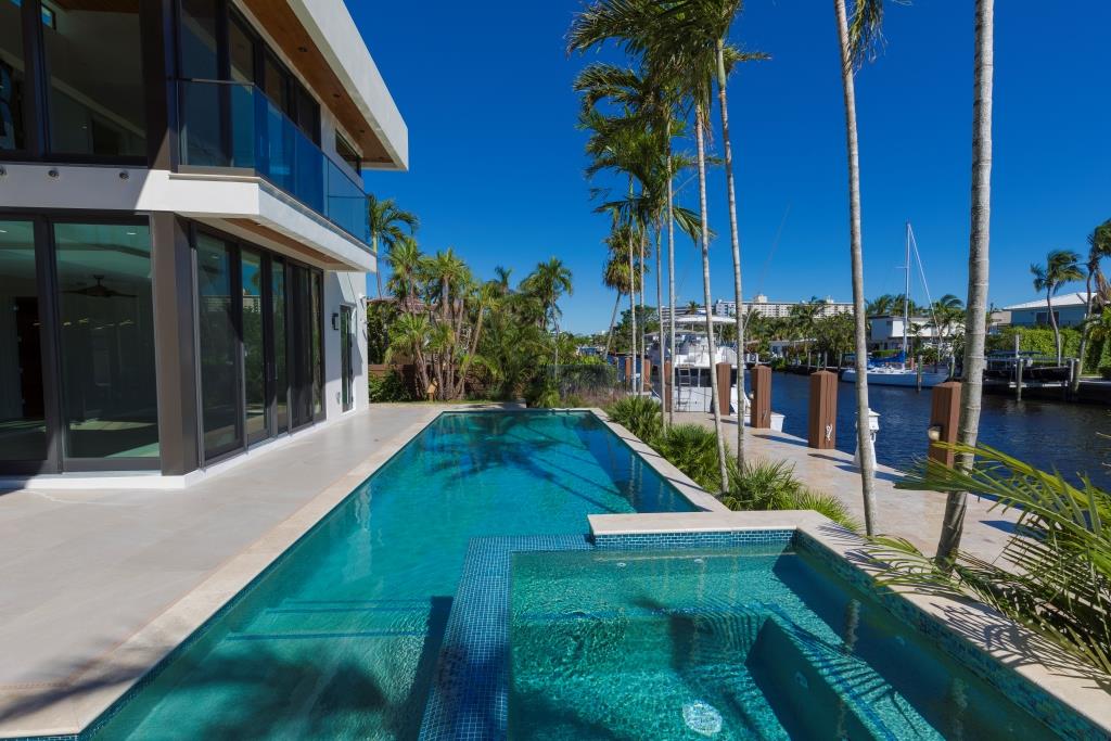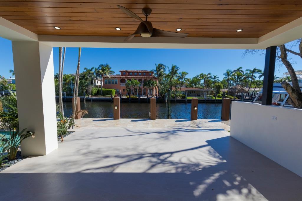 Upon entering, the guest’s focus is immediately drawn to the spaciousness of the great room, which flows seamlessly through 10 foot stacking doors opening to the huge covered outdoor patio and cantilevered gazebo with summer kitchen. The gleaming 58-foot pool, spa and beach entry, with unique Pebble Tec finishes, unify the patio and summer kitchen areas. Steps, bridging the water, lead to the boat dock. The brand new 100-foot all-concrete dock and seawall have 100 amp power and will accommodate an 80-foot Yacht. The canal is 130 feet wide and has the quickest ocean access in Las Olas.