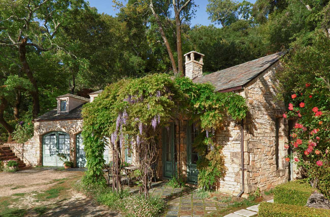 A stone guesthouse features a slate roof, hand assembled bespoke French limestones, high wood beam ceilings, a limestone fireplace, vintage paver floors, a one-bedroom with a full bathroom, a gym, and French doors opening onto the gardens.