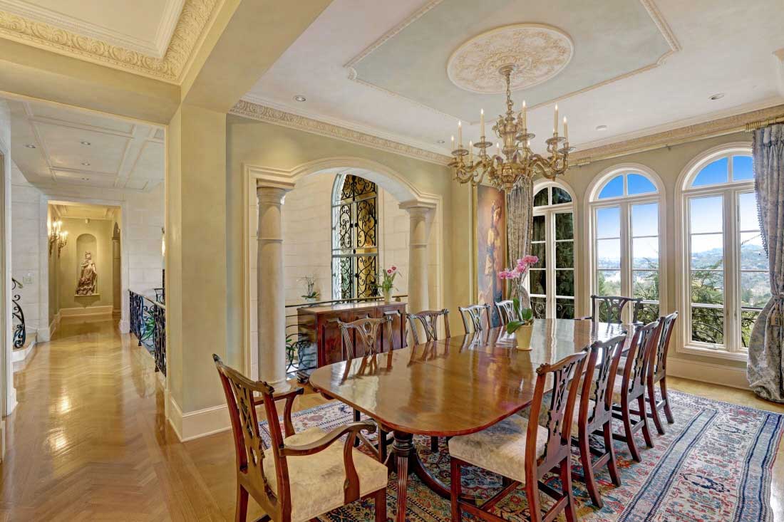 Stone columns and coffered ceilings with carved crown molding set an elegant scene in the dining room.