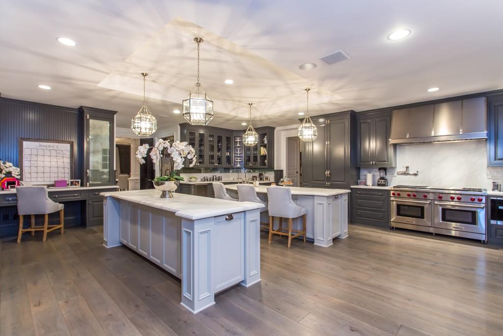 The elegant step-down dining room is highlighted by a herringbone marble floors and Venetian plaster walls. An expansive double island Chef’s kitchen is complete with breakfast nook, walk-in butlers pantry with sink, additional walk-in pantry with wine refrigeration, built-in desk and storage, Wolf appliances, and custom cabinetry.