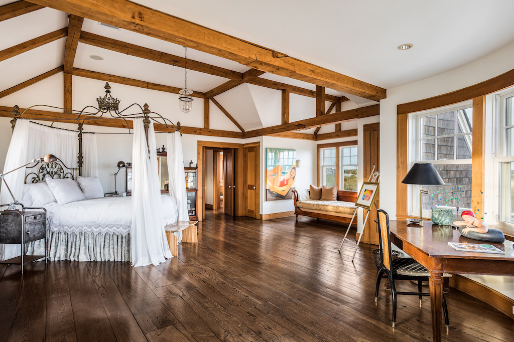 A craftsman-inspired staircase leads to the first floor, where lovely, paneled guest suites surround magnificent covered porches just steps from a vast lawn and steps to the beach.