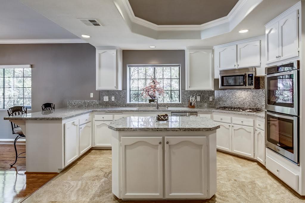 A white finish to cabinetry goes best with white, gray, or soft brown countertops. This classic, clean look makes the room look spacious and inviting.