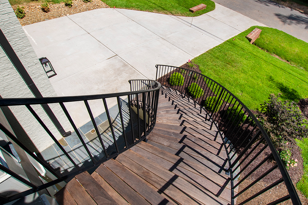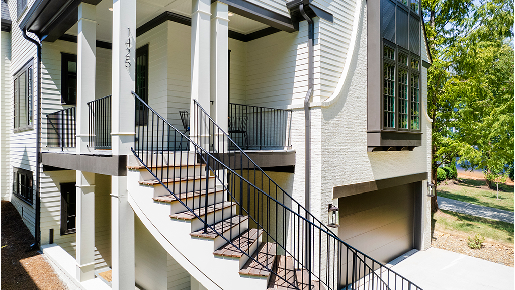 The extravagance in the exterior, with a custom floating staircase and custom iron lambs tongue railing, is drop-dead.