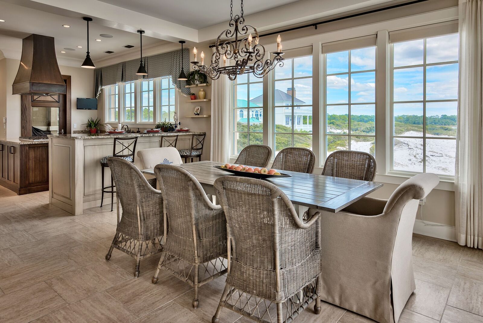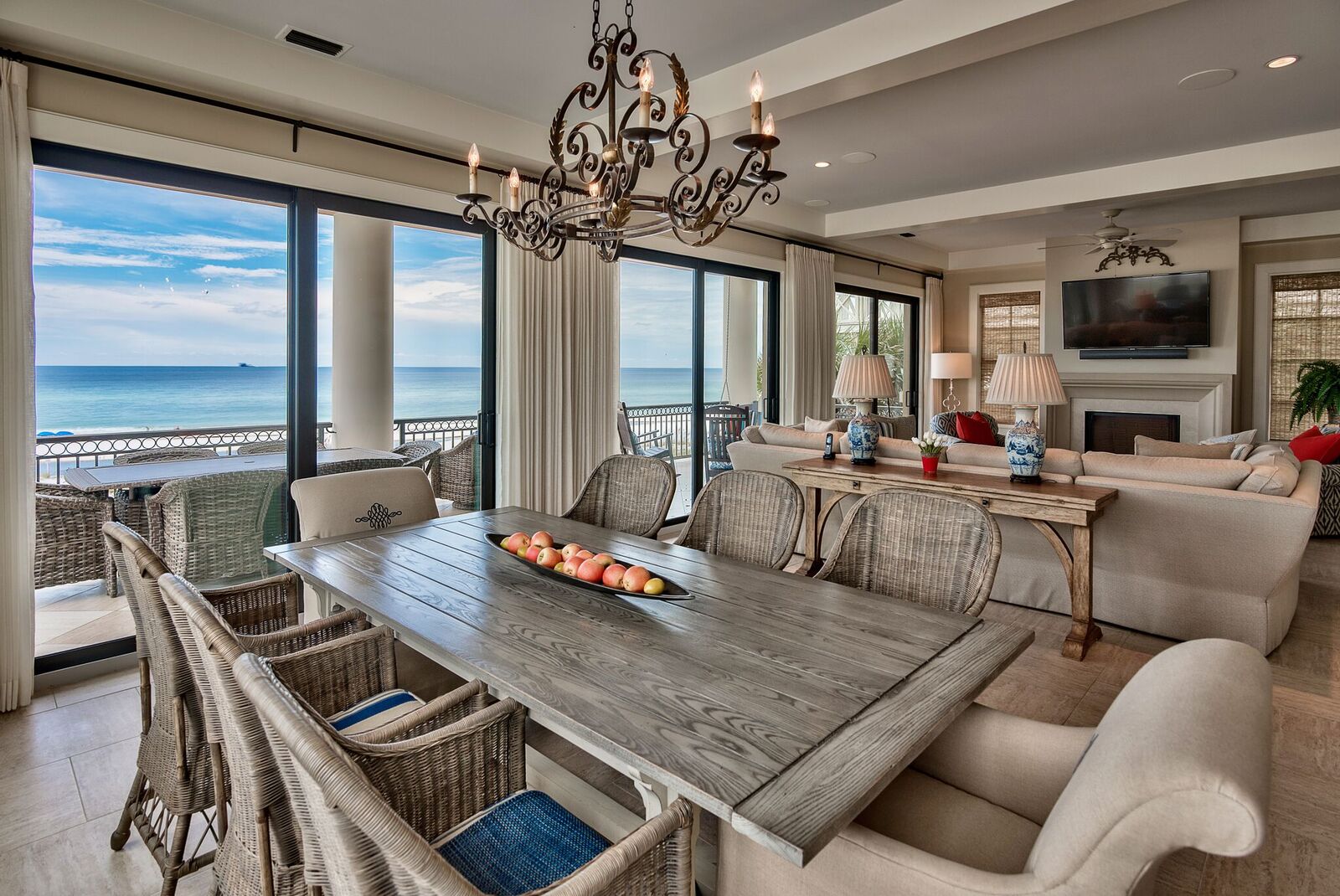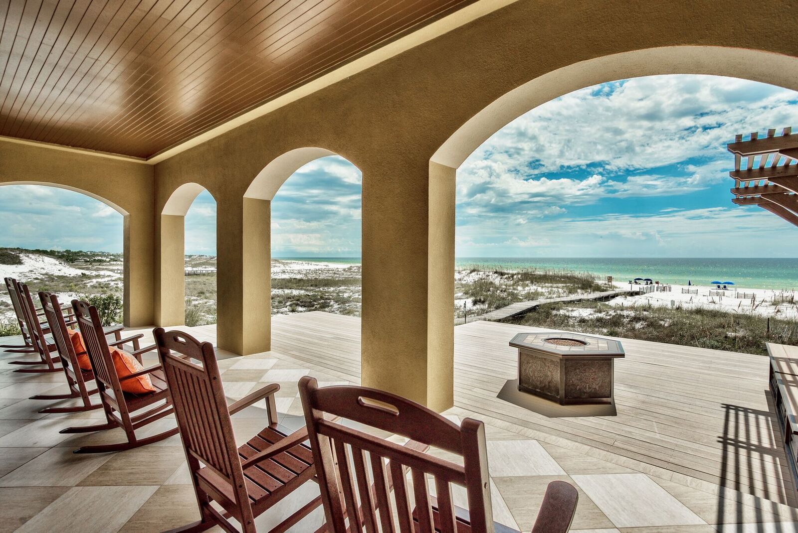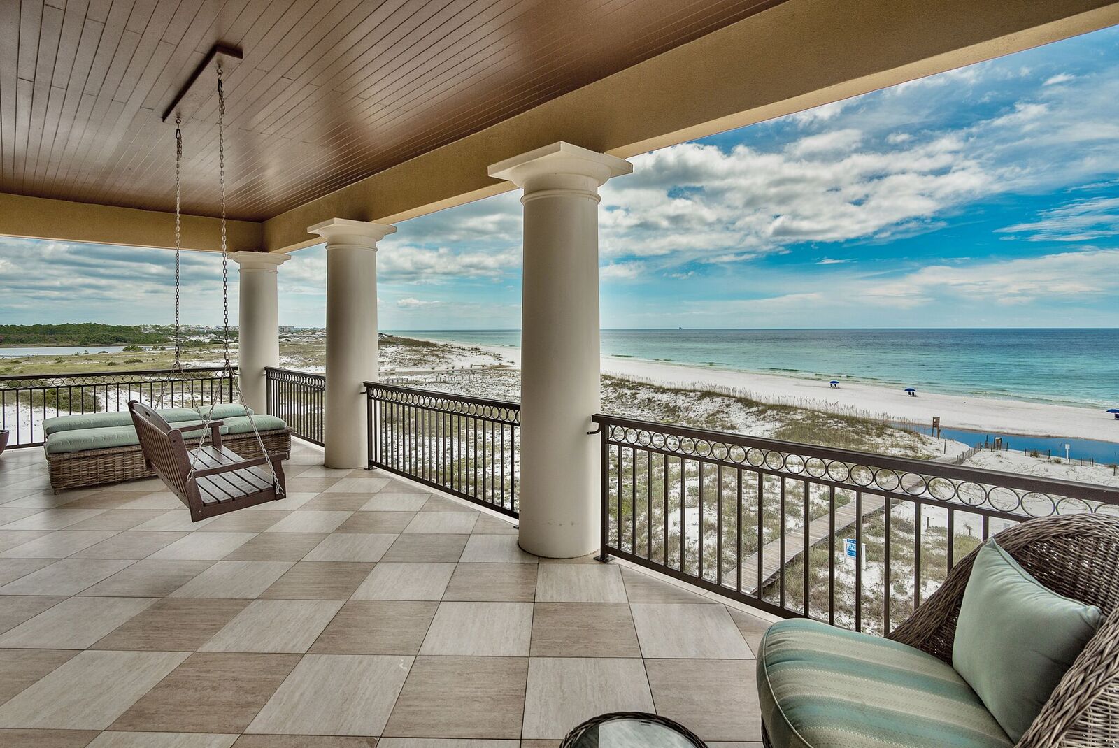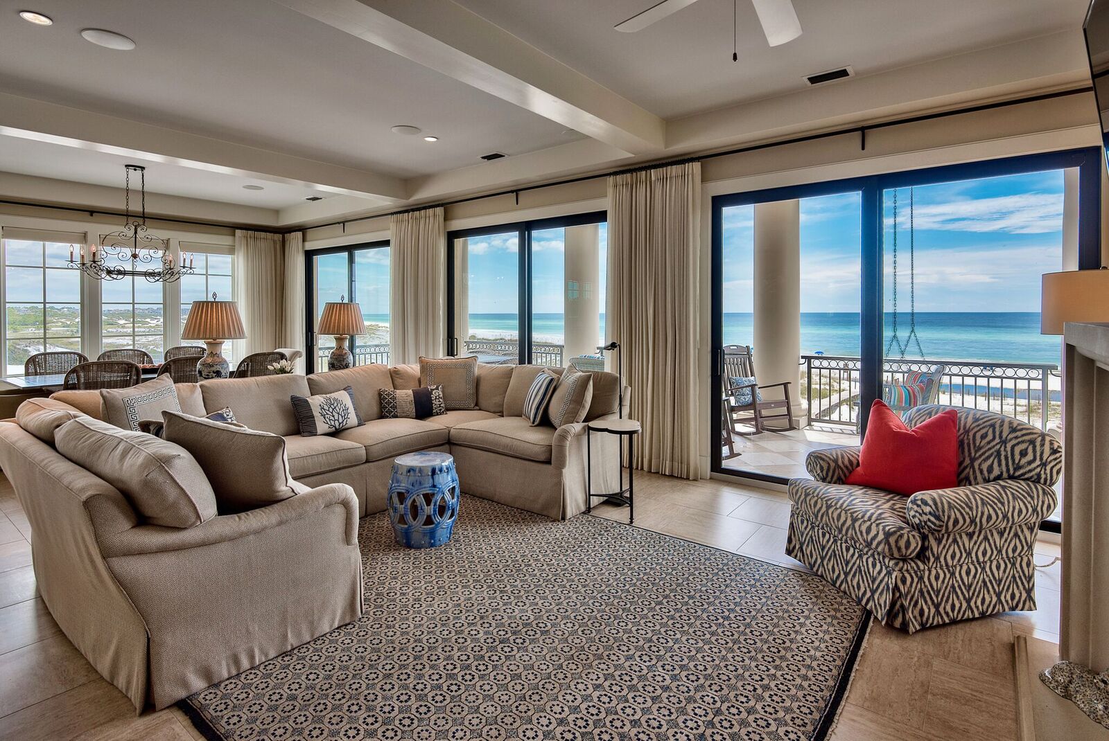 The second level features an open living and dining area, with glass spanning across the entire length of the home along with wrap-around windows to the east for panoramic views of the Gulf and Deer Lake State Park. Access an incredible Gulf-front terrace and enjoy outdoor dining to a cool beach breeze, or relax in one of the rocker chairs while taking in views.