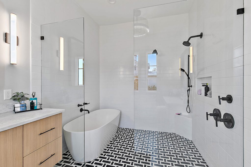 White oak floors, black Pella windows, and custom cabinetry enhance the sleek black-and-white aesthetic. The gorgeous kitchen features Wolf and Sub-Zero appliances, dual ovens, two dishwashers, a butler’s pantry, and a wet bar. The open family room showcases a striking 3D matte black fireplace surround.