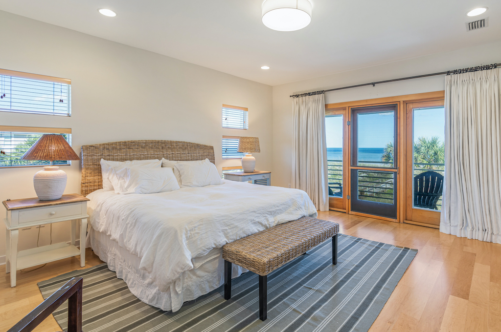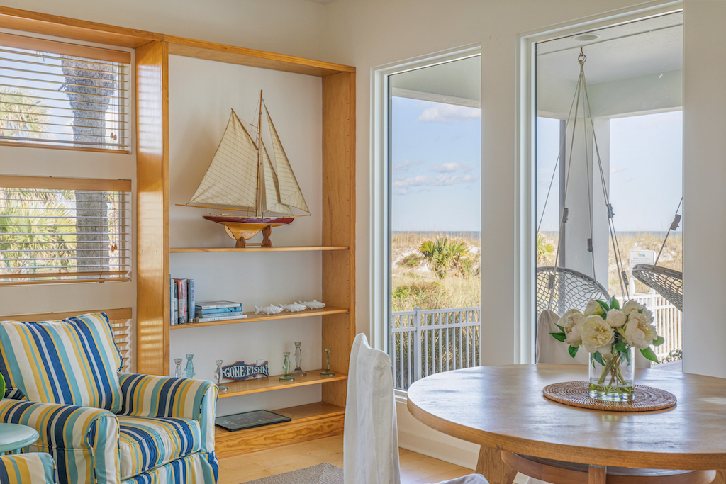 This gorgeous oceanside three-bedroom house, located in the quaint community of Neptune Beach, Florida, has been recently renovated with coastal touches throughout. On the first floor, wood flooring creates a bright, cohesive look between the dining area, living room, and library. Large sliding doors lead out to a wood deck where hanging hammock chairs swing in the ocean breezes. Outside the living room, the deck is expansive enough for a dining table that seats eight, perfect for pausing for refreshments after a game of badminton on the large fenced grass lawn which is protected from the wind by tall sand dunes and seagrass. The open concept kitchen features a breakfast bar, Thermador gas range, Subzero refrigerator, and built-in Thermador oven. The laundry room and half-bath are also on the first floor. The second floor has three bedrooms all accessible off a generous hallway with room for a reading nook on the landing. The master bedroom has an oversized walk-in closet, gracious bathroom with large walk-in shower, free-standing tub with ocean views, double sinks and a separate water closet. The balcony off the master is the perfect spot to watch the sunrise over the Atlantic Ocean while enjoying a cup of coffee, made at the in-room bar complete with stainless steel sink and glass shelving. The front courtyard boasts a contemporary pool area with water features, privacy hedges and an outdoor bar with granite counters. In addition, the property has easy covered access to a fourth bedroom and bath attached to the air-conditioned two-car garage. This warm and inviting yet modern oceanfront home is on a corner lot located three short blocks from the Beaches Town Center. The pedestrian-friendly neighborhood has many award-winning dining options, an independent bookstore as well as yoga and shopping.