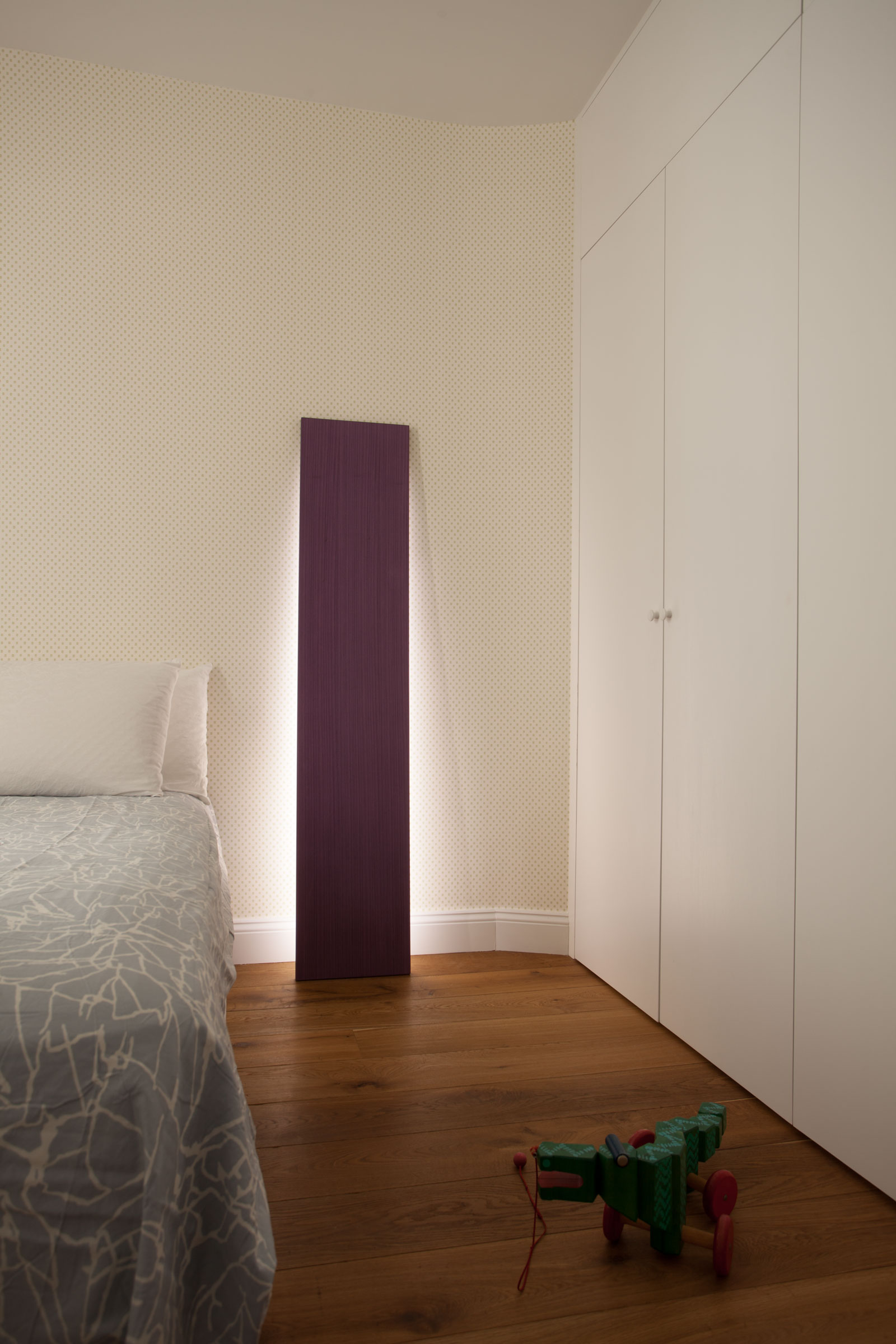 The wall lamp “Dear John” designed by Sergio Mannino in the bedroom which is part of a series of Limited Edition lamps designed as a tribute to the American artist John McCracken. The “Dear John” #1 is also available on sale at www.sergiomannino.com or at our First Dibs store.