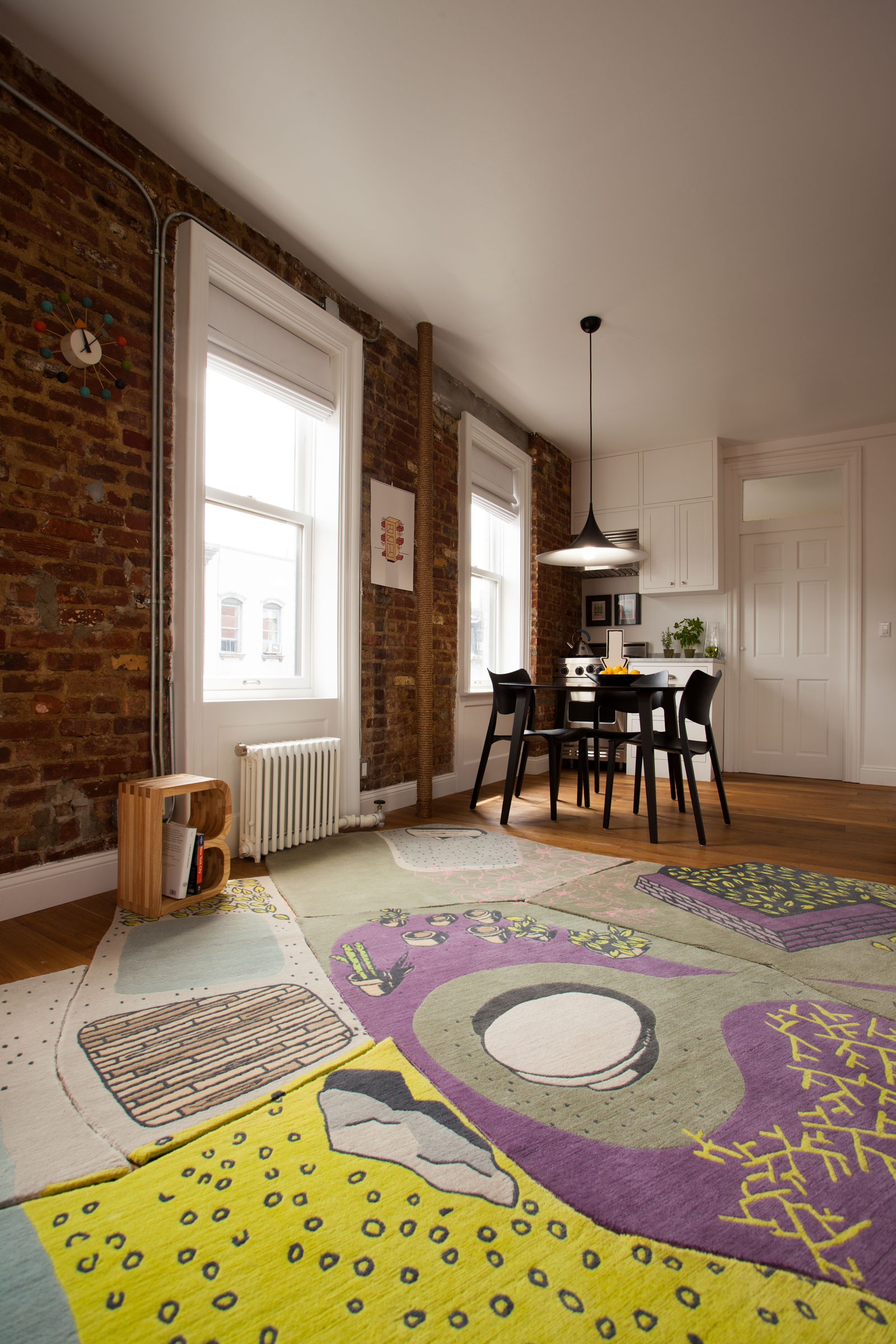 Sergio Mannino Studio designed the interior of a pre-war apartment in the West Village in New York. A 400 sqft one bedroom apartment, completely renovated while maintaining the original New York charm. The living room features the “No-flying Carpet” by Sergio Mannino Studio as well, handmade in Nepal by professional artisans.