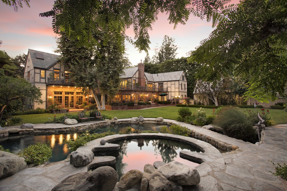 Traditional materials such as hand-hewn beams and hand-painted tiles provide a homey warmth that pairs well with its modern comforts. Between the main residence and the guest house, the Harry Warner Estate has 13,000 square feet of living space, seven bedrooms, and nine bathrooms. Other rooms include the grand public room with hand-carved wood panels, a step-down living room, a family room with a wet bar, and a large master suite with vaulted and wood-beamed ceilings.