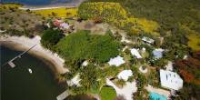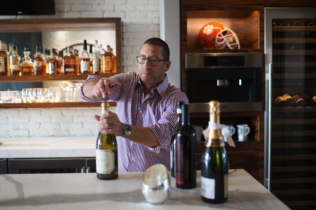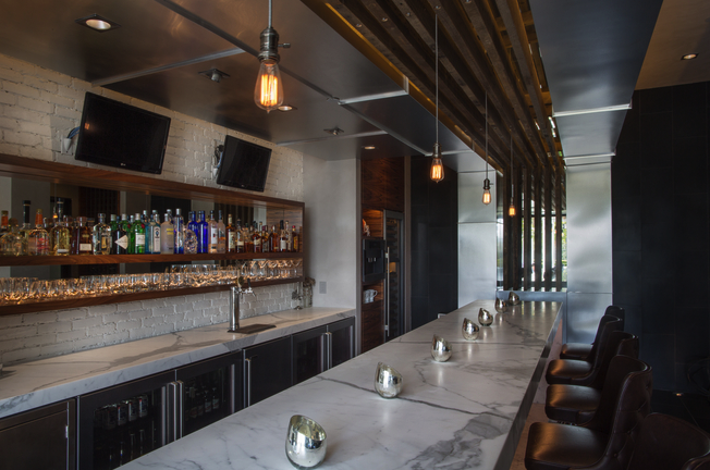 Check out this amazing home bar, complete with 22-foot marble countertop, leather-tufted stools, ceiling complete with wood and aluminum, and a liquor/barware display in front of a rosewood/bronze mirror.