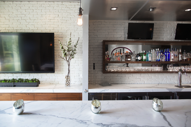 The bar room boasts indoor/outdoor seating, modern lighting fixtures, massive backlit wine coolers and white brick walls.