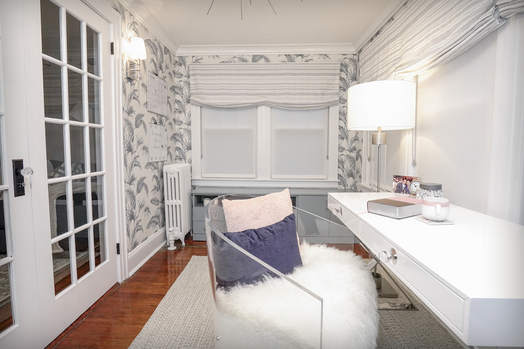To solve these problems, we gave the homeowner a large desk to be able to work and video conference along with custom-built storage for all of her filing needs. The room was also wrapped in beautiful wallpaper to provoke a calming energy to balance the stress of work.