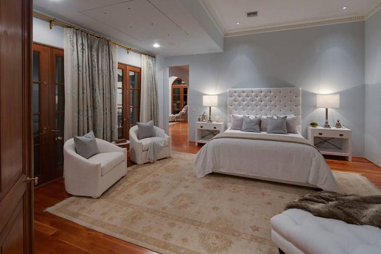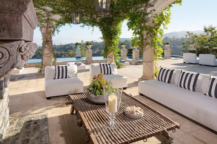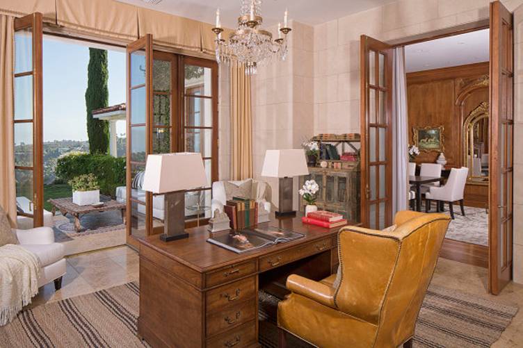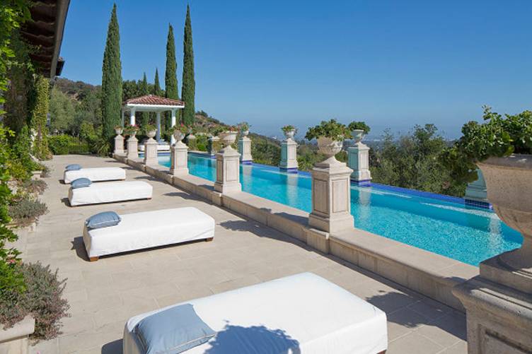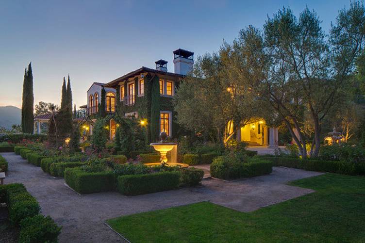 Poised in the prestigious neighborhood of Brentwood, right off Mandeville Canyon, the 12,300-square-foot Tuscan-style villa—comprised of eight bedrooms and 10 baths—sits on 8.52 lush acres.