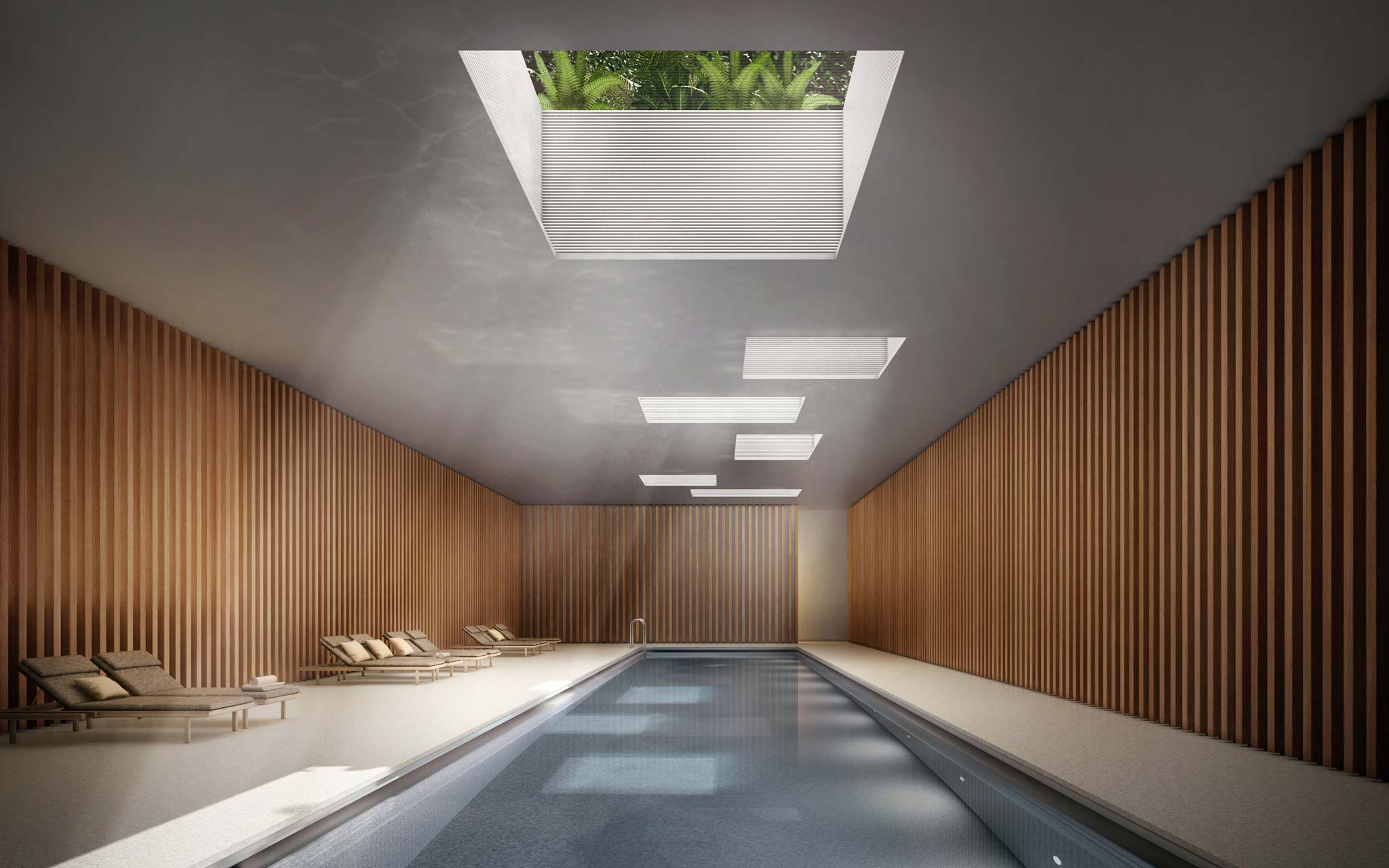 Jardim, the Portuguese word for garden, is a fitting name for the first New York building by Isay Weinfeld, the world-renowned Brazilian architect and interior designer. With a canopy of native evergreens and flowering trees, an ultra-private urban park envelops the two 11-story towers that comprise this West Chelsea development. Weinfeld has designed spas and pools for some of the most elegant contemporary resorts in the world, including the Fasano Las Piedras in Punta del Este, Uruguay. He brings that same attention to sensory experience to the amenities at Jardim, where a serene pool surrounded by cool terrazzo floors and warm reclaimed old-growth pine walls opens up to the courtyard gardens with staggered skylights, suffusing the space with sunlight. Additional amenities include a fitness center, massage rooms and a block-long tunnel that acts as a private driveway.