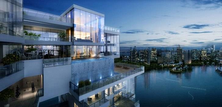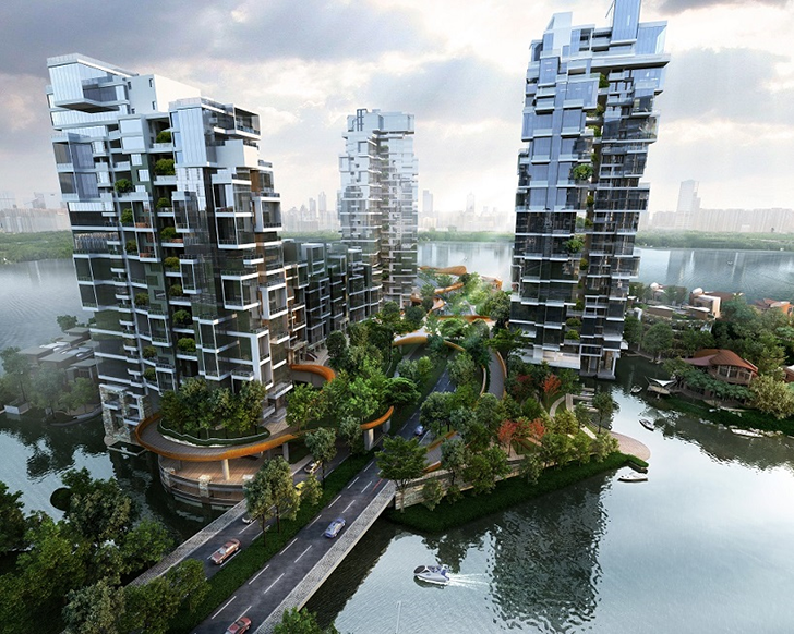 The residential spaces merge modern living, with environmental design. Located in Chengdu, China, each building is connected by a variety of elevated green areas, which include marinas waterways and land bridges. Each individual apartment is surrounded by its own personal garden, further integrating nature into the living spaces.The towers sit on a manmade lake and provide its residents with a stunning view and a wildlife sanctuary.