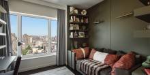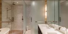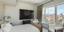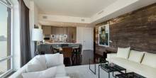 The sleek residence for rent has two bedrooms, two bathrooms, and floor-to-ceiling windows that expose a stunning view of the Manhattan skyline, including landmarks such as the Empire State Building, the Freedom Tower, and the Hudson River. The master bedroom features a spectacular spa bath with a large glass shower, stand-alone tub, and a large vanity with duel sinks and top-of-the-line fixtures. The apartment will rent fully furnished.