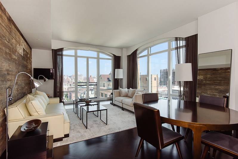 The sleek residence for rent has two bedrooms, two bathrooms, and floor-to-ceiling windows that expose a stunning view of the Manhattan skyline, including landmarks such as the Empire State Building, the Freedom Tower, and the Hudson River. The master bedroom features a spectacular spa bath with a large glass shower, stand-alone tub, and a large vanity with duel sinks and top-of-the-line fixtures. The apartment will rent fully furnished.
