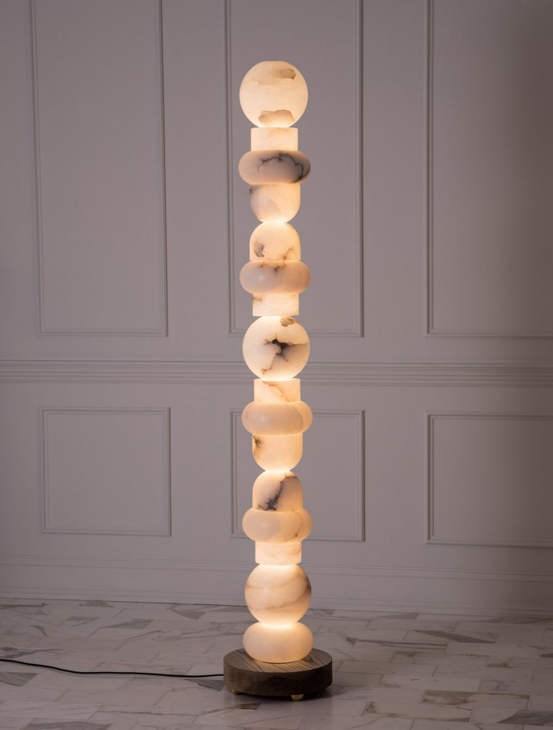 The elegant wood totem is made of black walnut and brass and retails for $7,500. The stunning alabaster totem, which highlights the translucency of the stone, retails for $35,000.
