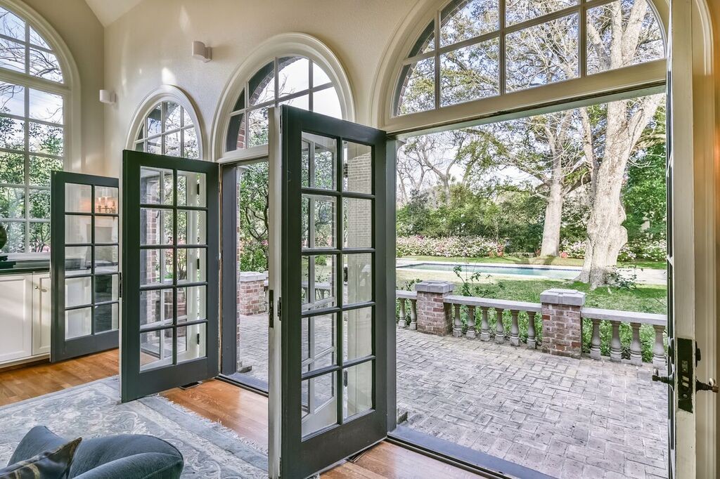 Convert exterior walls containing small windows into folding or sliding doors to invite the outside in. The large doors in this historic Houston home’s stunning room make for a smooth transition into the well-manicured courtyard garden.