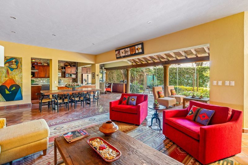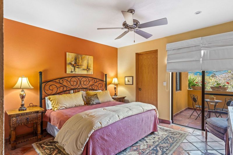 Offering step-free single-level living—the primary suite opens to a private garden and offers a dual-showerhead, dual-sink marble bathroom with a walk-in closet and carved-stone fireplace—Casa Privada proves popular with aging Boomers looking to age-in-place. The design reflects the American-style great-room plan with living/dining/kitchen all flowing seamlessly together, all of which are lit by a solid-glass curtain wall opening to a lush private side garden and terrace anchored by a water-chain fountain. The quartz-topped kitchen—surrounded by warm earth-tone bricks—offers both an island and bar, as well as an eat-in breakfast nook with an adjacent wrap-around coffee bar. The dual-zone living room is anchored by a massive hand-carved cantera stone fireplace, while the garden-side living room is topped by a viga beam and tejamanil woven-wood sloped ceiling, very popular with fans of Spanish Colonial architecture. The massive oversized garage with ample CostCo storage offers step-free direct access to the kitchen.