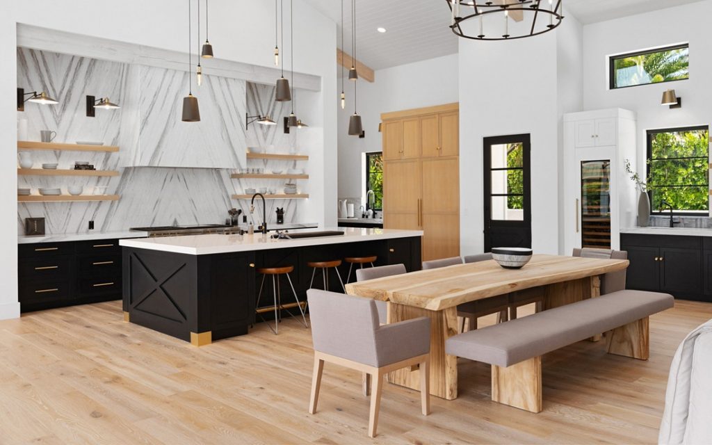 Nowhere is the home’s design language more evident than in the main living area and kitchen, where soaring vaulted ceilings and an expansive footprint establish a sense of scale and openness. A statement island anchors the space, surrounded by professional-grade appliances, top-tier cabinetry, and an oversized wine display that nods to the home’s entertaining potential. Bespoke lighting and layered materials add depth and warmth, resulting in a setting that is as visually striking as it is highly functional.