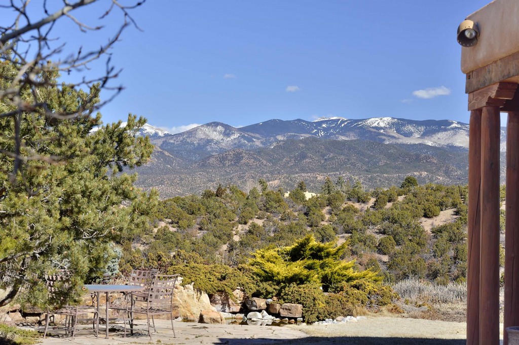 Exquisitely detailed, this John Midyette-designed 2 bedroom, 4 bathroom, partial adobe home is set on 3.26 acres in the Casas de San Juan gated community. Enter the courtyard through an ornate wrought-iron gate. Design accents will catch your attention as you open the hand-carved wood double doors to a foyer with elegant tile floors and hand-painted coved ceiling. Pass through the wet bar into the grand living room with high ceilings, gorgeous wood beams and chandelier. The fireplace with decorative mantel is a dramatic centerpiece of the room and stunning mountain views from the windows and French doors add to the appeal. The spacious gourmet kitchen boasts custom wood cabinetry, utility room, center island, Saltillo tile floors and built-in appliances with matching cabinet fronts. There’s a formal dining room as well as several seating areas; some with kiva fireplace and access to the portals surrounding the home. The master suite has a separate seating area with kiva fireplace, generous walk-in closet and adjacent study. The spa-like master bath has jetted soaking tub, custom tile vanity and views of the distant mountains. Visitors can relax in the guest suite with a kitchenette, fireplace, ensuite bathroom with dual vanities and a separate entrance. Enjoy outdoor entertaining on the portals, with landscaping, a water feature and views for miles. Extra features are Talavera tiles, wood floors, custom lighting throughout. The home is just a short drive from Santa Fe plaza and the Opera.