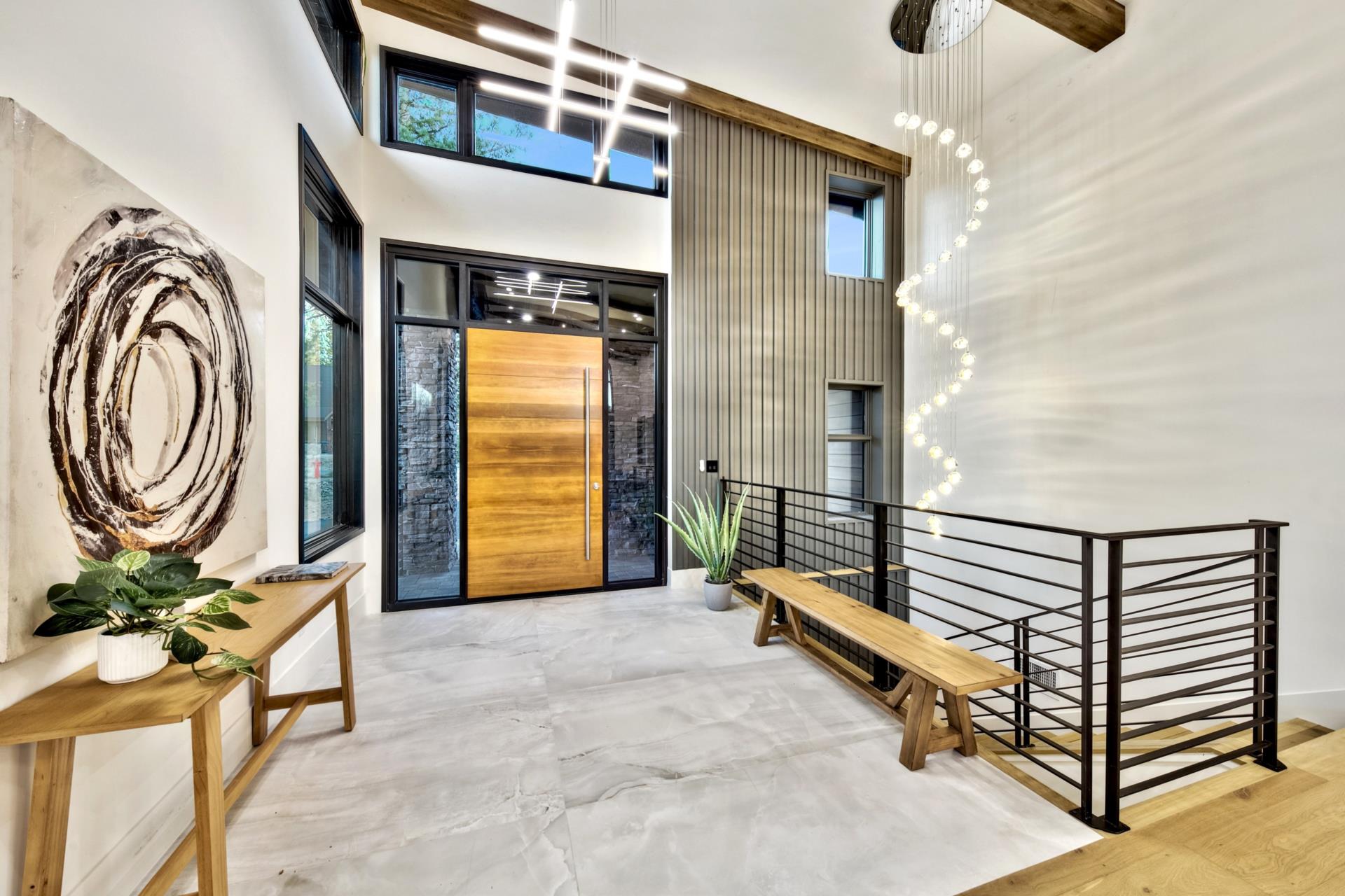 As you walk inside the home you’ll notice designer tile in the entrance along with decorative wood accents that make even the most popular Pinterest board take note. The first en-suite primary bedroom is right on the main floor just past the entrance. The bedroom features high ceilings and wood accents along the wall and views of Grey’s Crossing Golf Course. The main floor comes with two primary bedroom that features in-floor heat to keep your feet warm on a cold snowy night along with an ultra-modern floating vanity. As you leave the first primary bedroom and enter the open concept living room/dining/kitchen area you’ll notice ambient southern light throughout the main floor highlighting the fireplace’s solid wood mantle, wood beam accents on the ceilings, the waterfall quartz island, and Monogram appliances built to last in the kitchen. Within the kitchen, you’ll find a 48-inch range with 6 burners, a 48-inch built-in refrigerator, a dishwasher, and Zephyr built-in beverage refrigerator. Before you begin to explore the downstairs, you can’t miss the SECOND main floor primary ensuite bedroom, powder room, mud room, and nearby laundry room to ensure no snow, mud, or dirt is ever tracked throughout the home.