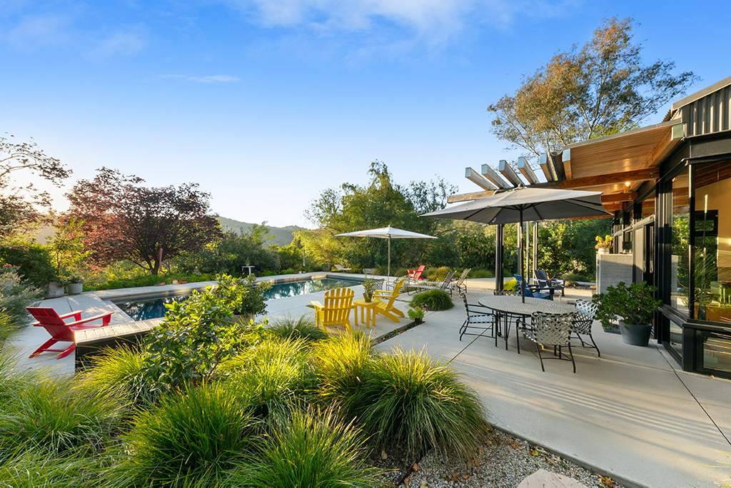 Nestled on two gently sloping acres studded with majestic oaks and fragrant eucalyptus, this fully reimagined Topanga estate offers a rare blend of refined luxury, privacy, and natural beauty. Designed for both connection and independence, the property features multiple living spaces thoughtfully integrated into the landscape with a system of winding paths, orchards, and curated gardens. At the upper end of the property, the main residence showcases sleek contemporary finishes, expansive glass doors, and a seamless indoor-outdoor flow, ideal for entertaining or a quiet retreat. The resort-style pool is surrounded by fruit trees and curated landscaping, creating a tranquil, sun-soaked oasis with sweeping sunset and canyon views. At the opposite end of the property, down a meandering path lies a beautifully appointed guest house with its own private outdoor entertaining area, offering comfort and autonomy for family, friends, or creative pursuits.
