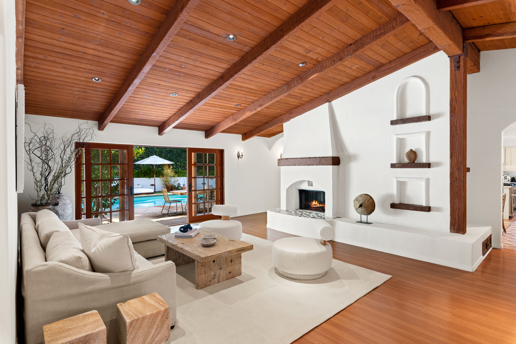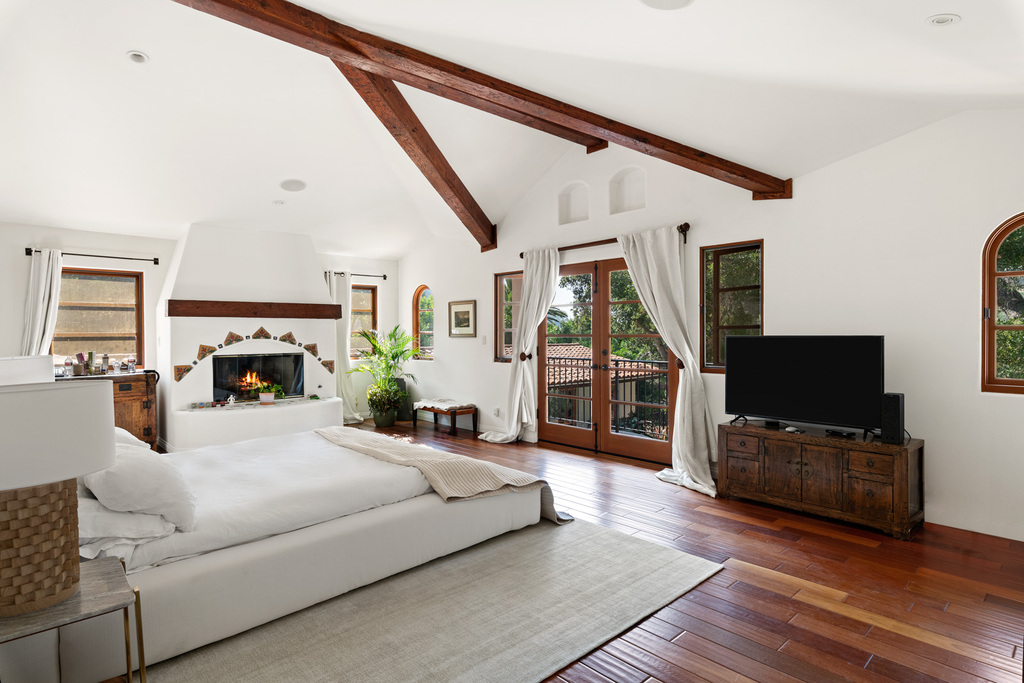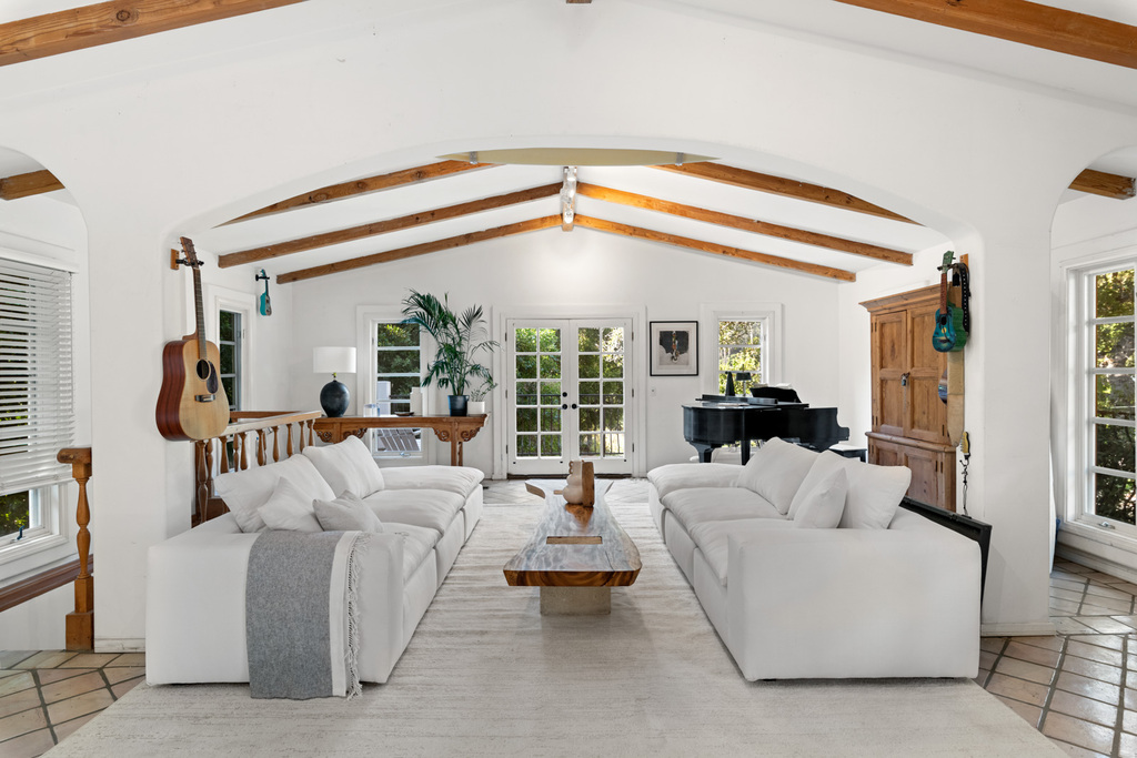 Nestled within the exclusive guard-gated Serra Retreat community, this exquisite Spanish-style estate spans approximately two acres of prime Malibu real estate. This luxurious residence perfectly blends classic architectural elegance with modern amenities, offering an idyllic retreat for discerning homeowners. The property boasts a stunning Spanish-style facade characterized by its terracotta roof tiles, arched doorways, and wrought-iron accents. Inside, the home features an open floor plan with high ceilings and exposed wooden beams, creating an inviting and warm ambiance. Large windows and French doors throughout the home provide an abundance of natural light and seamless indoor-outdoor living.