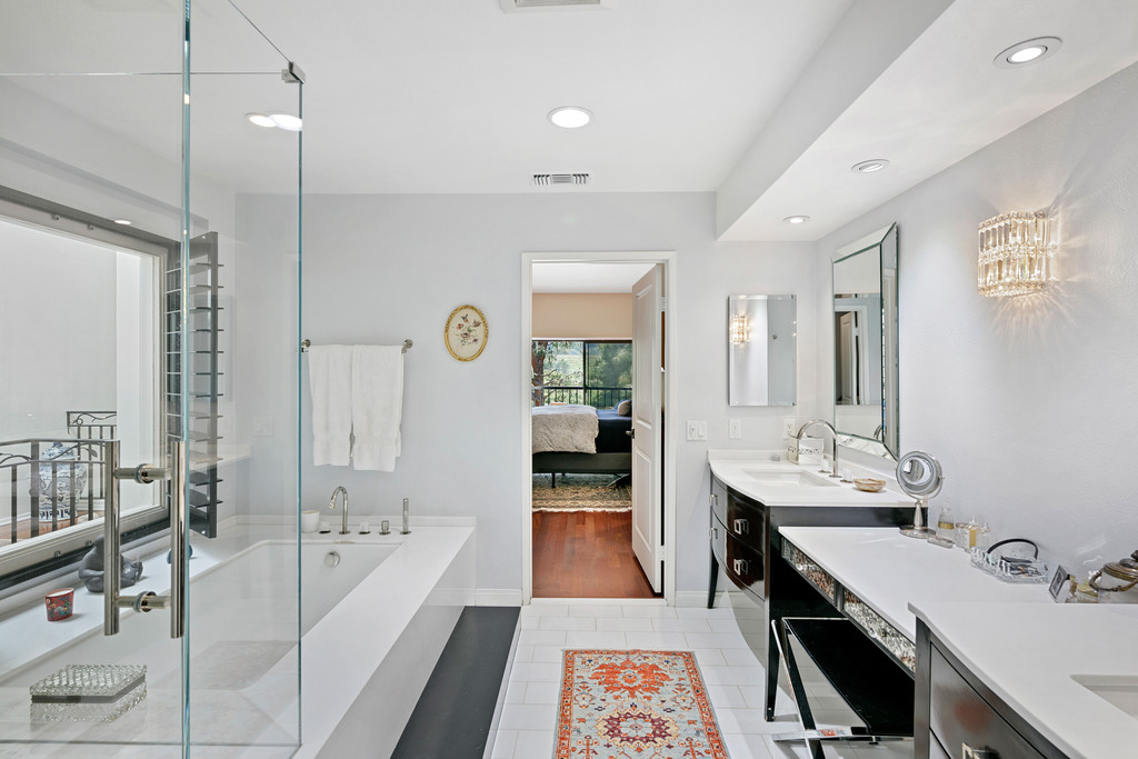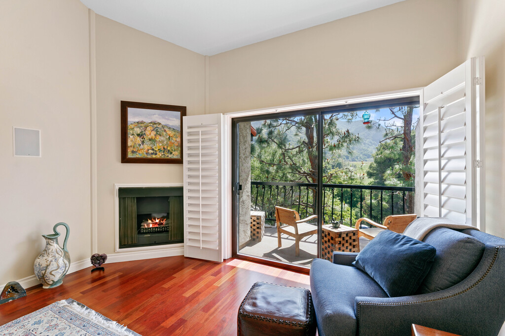 The primary suite is a haven of serenity, boasting vaulted ceilings, a sumptuous en-suite bathroom with a soaking tub, and a private balcony where you can savor your morning coffee amidst the stunning mountain backdrop. The second bedroom, equally spacious and inviting, also features an en-suite bathroom and ample closet space. Outside, the meticulously landscaped grounds provide the perfect setting for al fresco dining or lounging in the California sunshine.