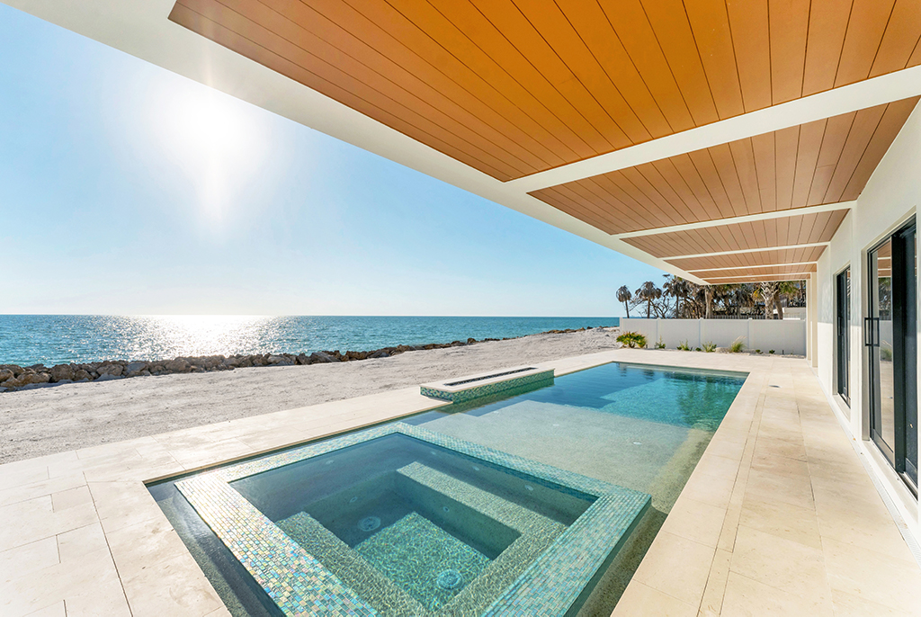 The chef’s kitchen is a design showpiece, featuring European cabinetry, dual waterfall-edge islands clad in book-matched 3cm quartz, and premium Sub-Zero & Wolf appliances. Dual laundry rooms, breakfast nook, and custom built-in vanities provide elevated everyday living. The primary suite is a private sanctuary, complete with a spa-like bathroom featuring a 71-inch freestanding tub, dual rainfall showers, a makeup vanity, and a 400 sq ft walk-in closet. Every bathroom throughout the home is appointed with bespoke cabinetry, quartz surfaces, and backlit mirrors. Designed to impress from every angle, the home is finished with smooth stucco, level 5 drywall, hardwood floors, imported tile, and integrated LED tray ceilings. A sleek rooftop terrace crowns the home, offering panoramic views of the Gulf and beyond. Step outside to your private resort: an expansive terrace with an oceanfront pool, floating spa, sun decks, outdoor fireplace, and fully equipped kitchen. Lush, tropical landscaping, Zoysia grass, and a concrete drive with turf inlays complete the impeccable exterior design. Sleek metal railings accentuate balconies and the rooftop for a modern edge. Set on a half-acre of prime waterfront, this property also includes deeded bay access across the street. This is coastal modern luxury at its finest–a rare opportunity to own a brand-new, Gulf-front estate on one of Sarasota’s most coveted stretches of sand.