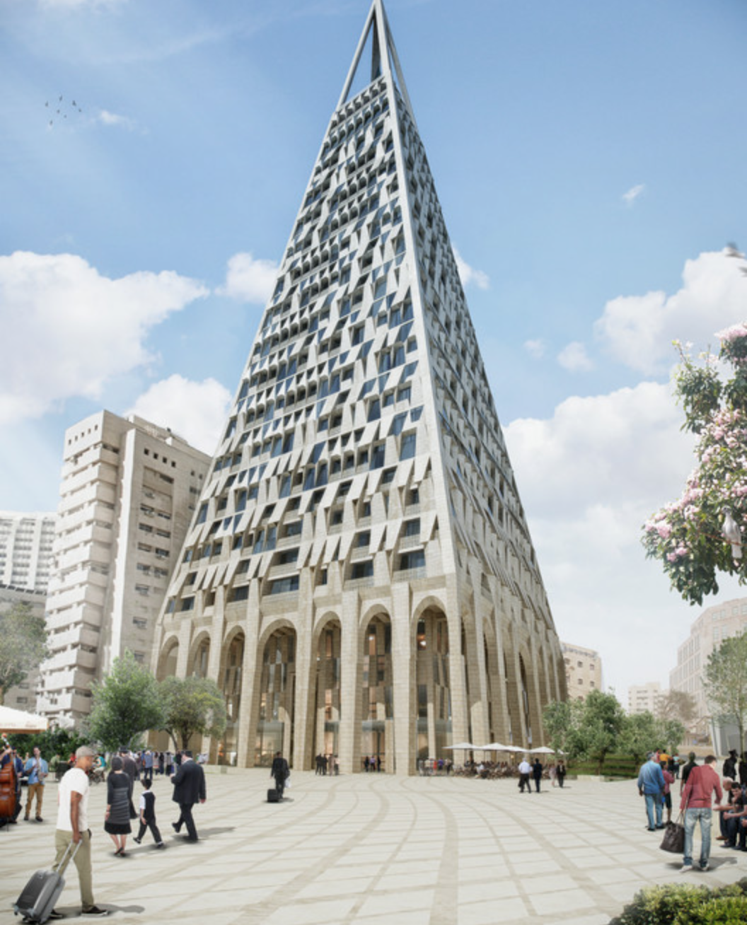 Conventional wisdom suggests the world’s most prominent pyramids at Giza, Egypt, were erected via slave labor. So the ironic nickname of Jerusalem’s “Freedom Pyramid” high-rise will not be lost on the ancient world. Designed by Daniel Libeskind (of Studio Libeskind) and Israeli architect Yigal Levi, the future mixed-use stone-and-glass tower will boast 200 luxury apartments, a boutique hotel, commercial space, a rooftop restaurant and even an observatory.