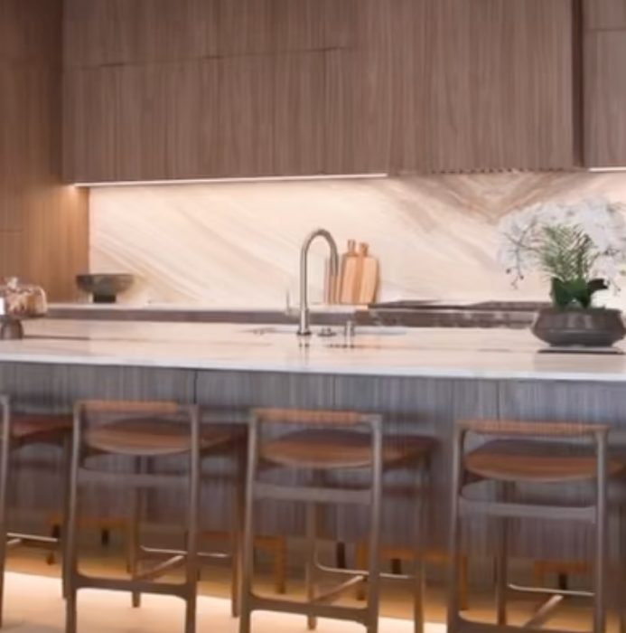 The residence features designs by Martyn Lawrence Bullard and boasts six bedrooms, a guest apartment, pool and spa, home theater, reclaimed brick fireplace, and 2.5 acres of lush property.