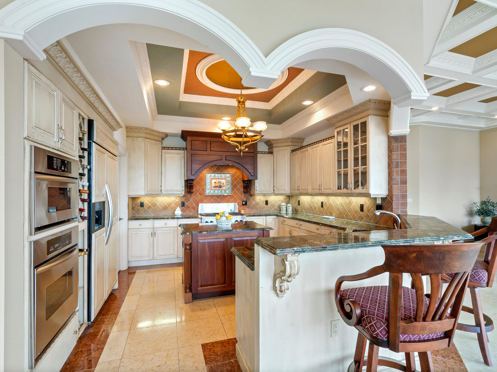 Great location, stunning views, and near-perfect boating water await in this beautiful Country Club Shores residence on Longboat Key. Boasting 100 waterfront feet, amazing outdoor space and long water views including the Sarasota skyline in the distance, this home exudes upscale island living at its best. Upon entering through the custom double doors, one is greeted by a dramatic two-story foyer with a grand staircase. The main living area boasts open views with southern exposure and includes features like marble flooring, a gas fireplace, coffered ceilings, and large banks of hurricane windows and doors providing ample natural light. The kitchen features stainless steel appliances, a walk-in pantry, and an adjacent large dining area. The family room with a built-in wet bar is adjacent to the kitchen and dining area and is the perfect spot to relax or play a game of pool after a fun-filled day on the water. The first floor also includes an office with an en-suite bathroom.