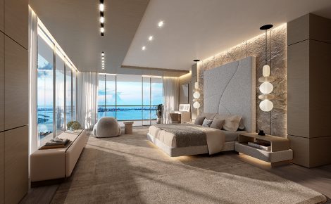This residence, with its expansive floor-to-ceiling windows, offers unobstructed 270-degree views of Miami Bay and the Atlantic Ocean, capturing the city’s vibrant essence.