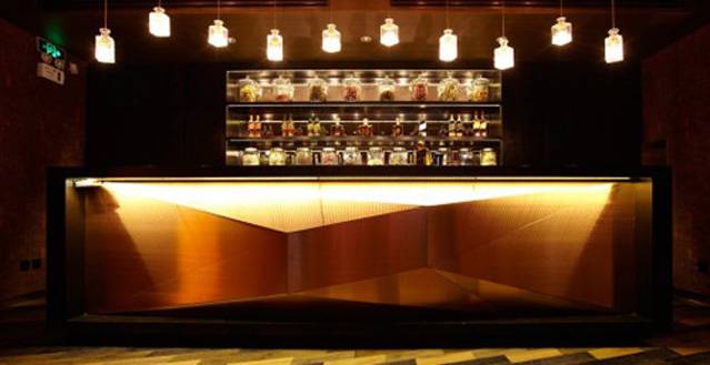 Recycled etched glass bottles create delicate hanging luminaries that reflect the liquor’s spirit brilliantly. Even the restrooms have the whiskey’s caramel shade and are outfitted with an antique basin and a relaxing Chinese peaks painting.