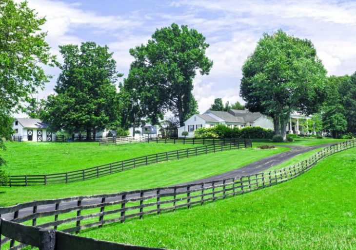 The estate, located outside Lexington, Kentucky, features six bedrooms, seven bathrooms, three barns, a guest house, pool, and is only two miles from historic Keeneland Race Course.