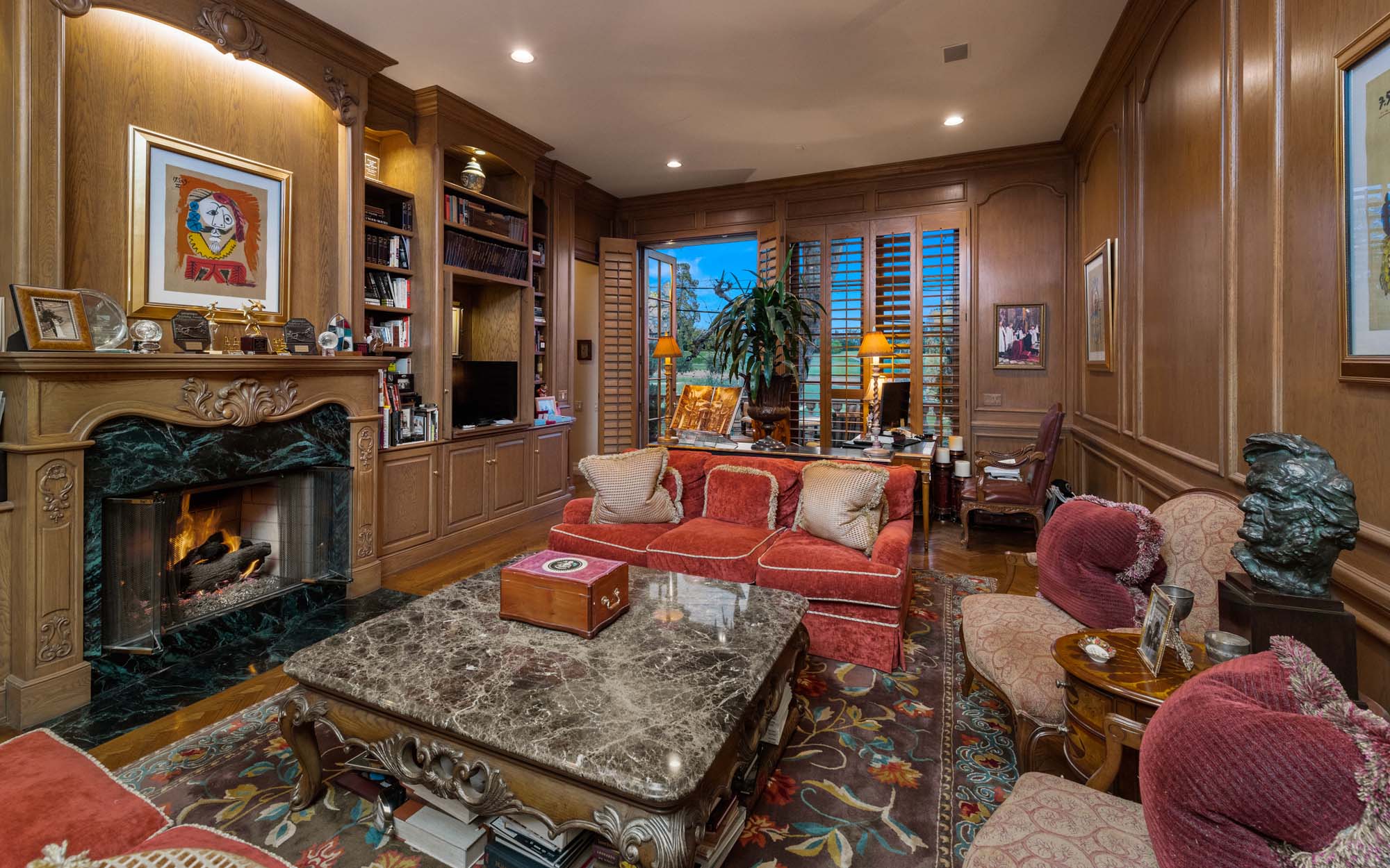 Majestic design, sensational amenities, and verdant vistas of the Los Angeles Country Club golf course add up to refined luxury. With the signature vision of designer Aleck Dugally, the gated residence is exceptionally spacious, with double height ceilings, sweeping curves, fine woodwork, impressive fireplaces, and high-end fixtures and features for a luxurious lifestyle. From the main level and the upper floor, rooms open onto wide balustrade balconies that overlook the 9th hole tee and the surrounding acres of manicured landscape. The grand chandelier foyer, formal living room, and formal dining room suggest elegant entertaining, easily choreographed in the expansive chef’s kitchen. The main floor also has a distinguished paneled library/office, and all three levels are served by an elevator. The bedrooms upstairs include a magnificent dual primary suite complete with balconies, views, and walk-in closets, as well as two more bedroom suites. There is another en-suite bedroom on the courtyard level, plus a spacious media and billiards room, wet bar, wine storage, and French doors opening onto a charming courtyard patio with ample room for dining, entertaining, and relaxing. An achievement in luxury in a one-of-a-kind trophy location.