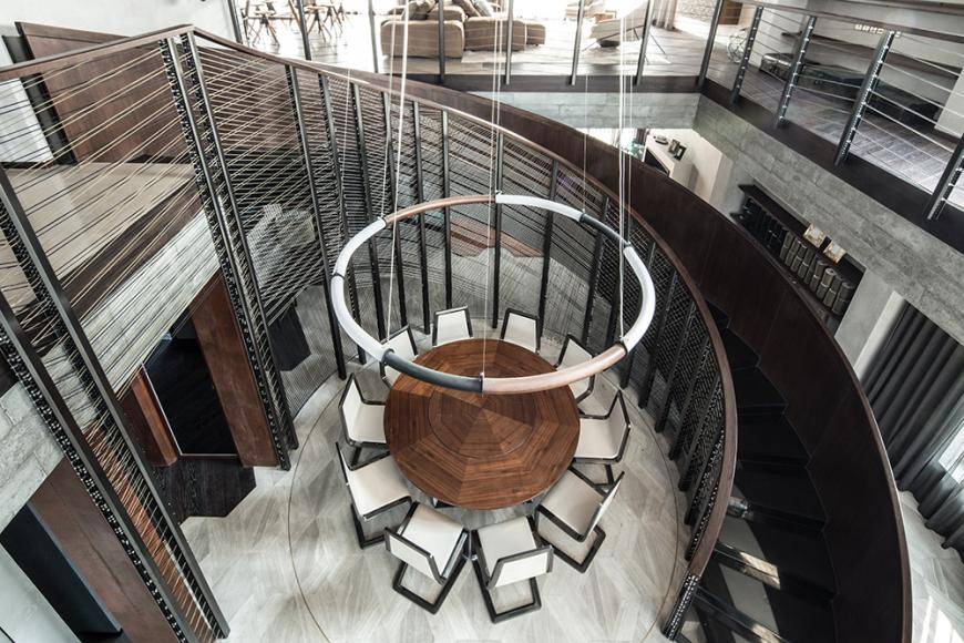 “Xintiandi Penthouse” is largely an amalgam of sheet metal, weathered metal, and metal cabling. Wang utilized five kilometers of the latter and employed traditional boat-building techniques to do so. Much of this went to the penthouse’s striking cantilever staircase.