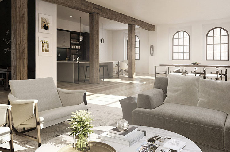 Designed by CetraRuddy Architects, the loft-style apartment, with high ceilings and an open kitchen, is lined with reclaimed wood and wide plank white-oak floors, and is finished with marble and stainless steel accents.