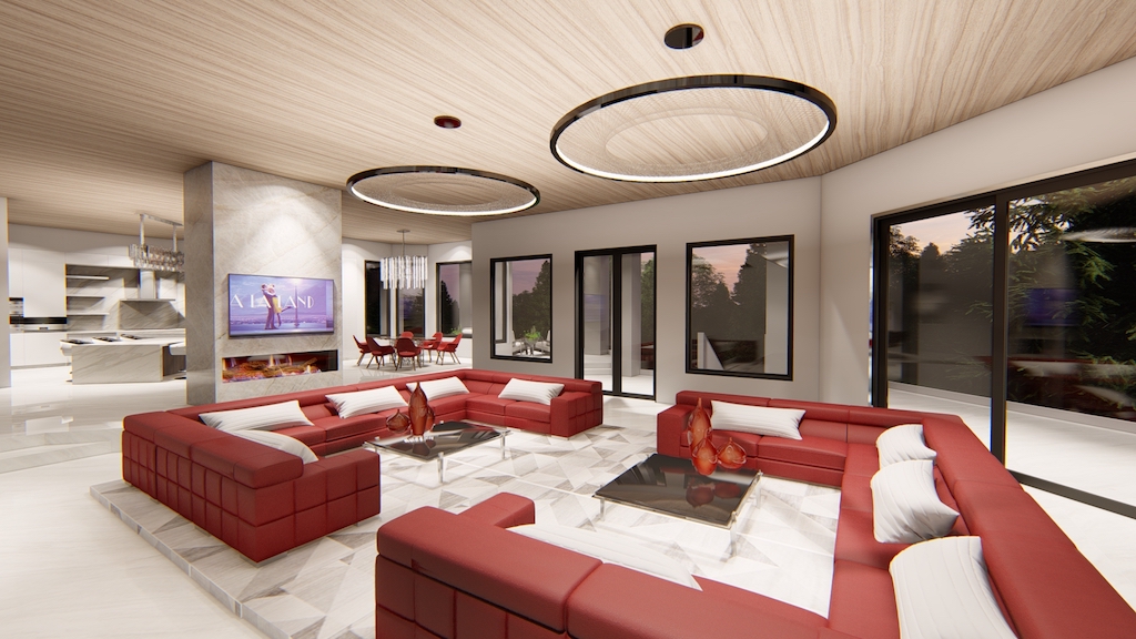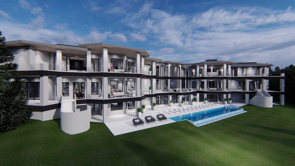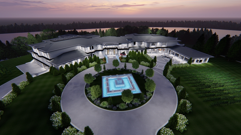 A helipad, boat dock, sandy beach, formal gardens, and a pool terrace are also envisioned for this one-of-a-kind estate. A full 3D visualization of the architecture and surrounding landscape was created to showcase the extraordinary plans for the estate.