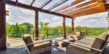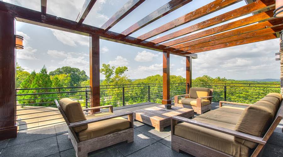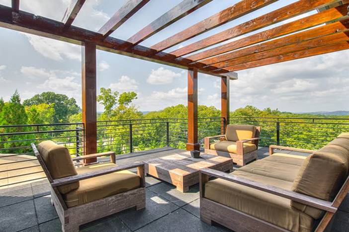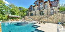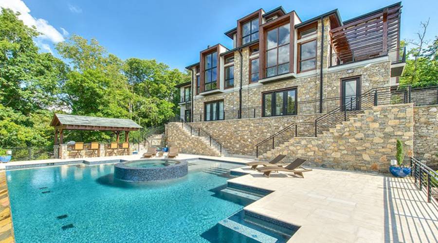 This Tennessee pad offers a modern kitchen with state-of-the-art appliances, fireplaces, high ceilings, screened-in porch area, French doors, five bedrooms, recreation space, fitness room, home bar, outdoor dining area, pool with hot tub and more.