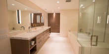 The unit’s kitchen is new and comes with custom cabinetry and a steam oven. A his-and-hers spa, a steam shower, a soaking tub, and closet-wardrobe style cabinets can be found in the master bathroom.