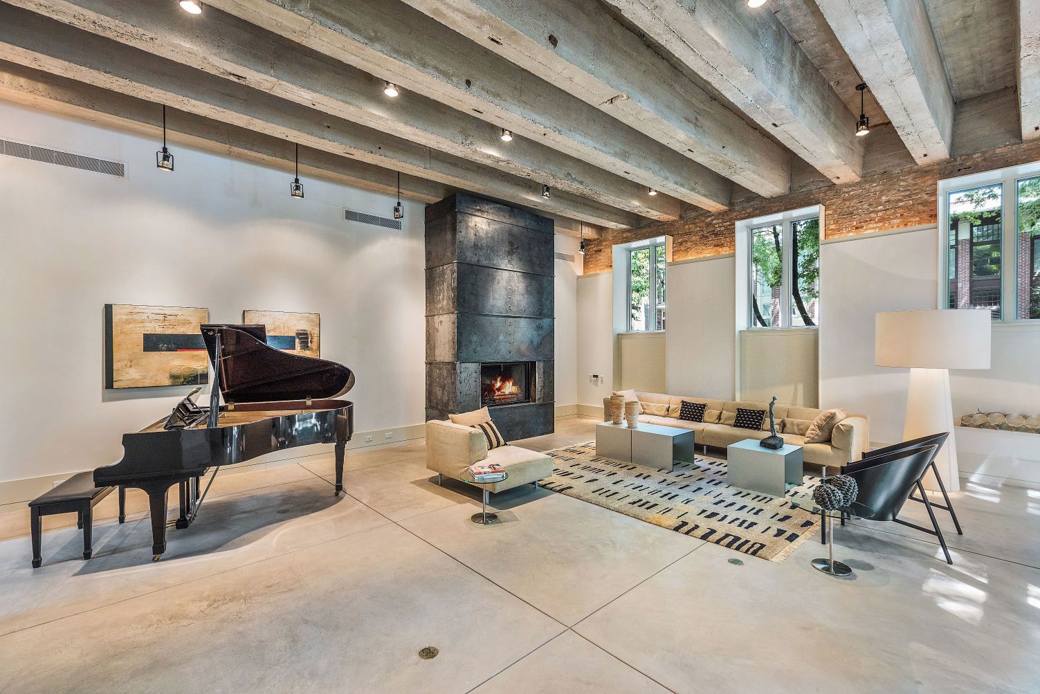 Architectural details include concrete-beamed ceilings, large windows, oversized poured concrete slab floors with radiant heat, and a floor-to-ceiling custom fireplace. Park your vehicles in the two-car attached garage, and enter your new home.