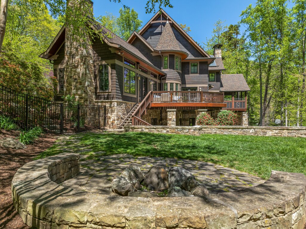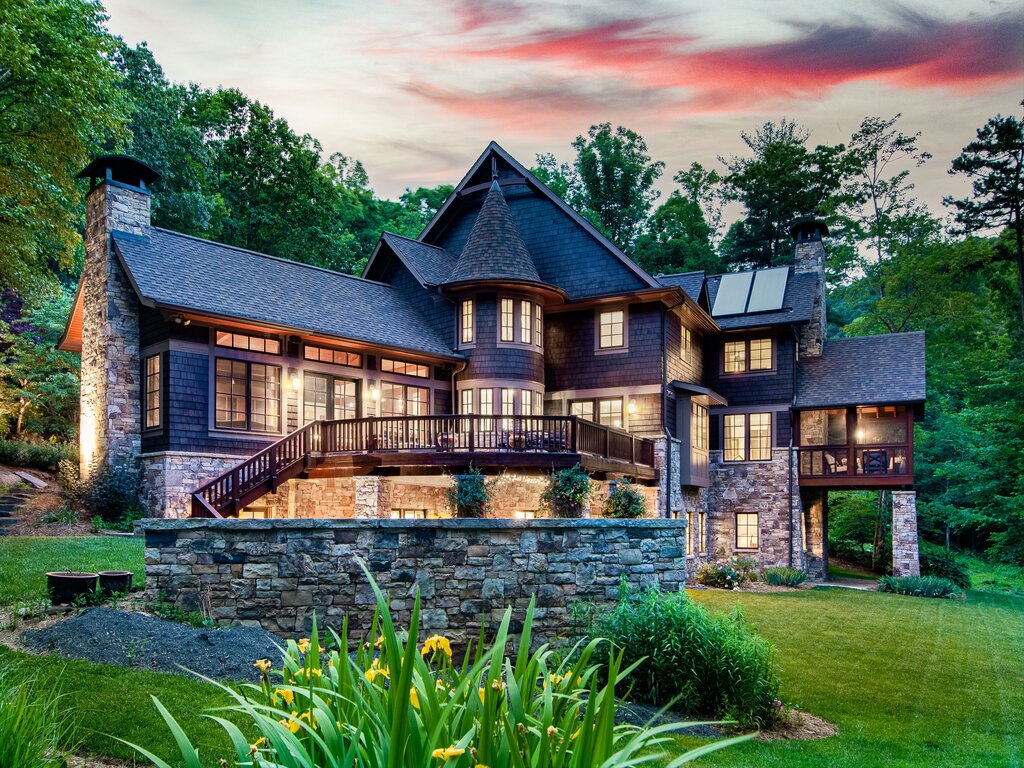 An incredible luxury residence located in beautiful North Asheville and appointed with the finest craftsmanship, conveniences, fixtures, and finishes. Natural materials, including Canadian red cedar shingles, timbers, and regional stone, marry the house to its mountain setting. Green technologies include radiant floor slabs, domestic hot water aided by solar radiant panels, and Structural Insulated Panels (SIPS). Custom cabinets, doors, and trim use over 5,000 board feet of lumber reclaimed from the site.
