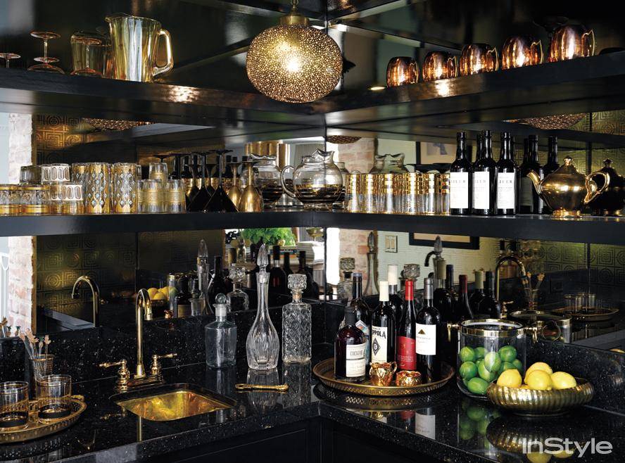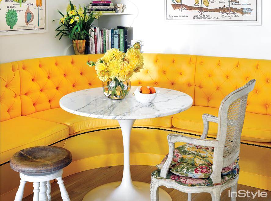 Bold colors and flattering textures distinguish Conrad’s space. “I always gravitate toward feminine details… on a garment, it’s a bow; on a sofa it’s tufting,” Conrad told InStyle. Bright upholstered pieces in the living room and kitchen testify.