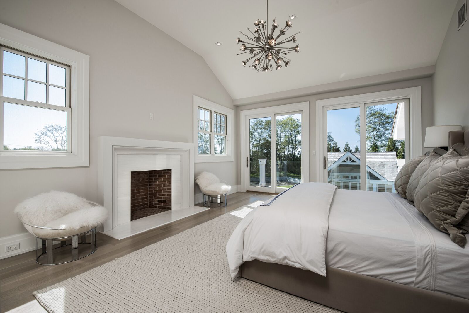 The luxurious master suite has its own wood-burning fireplace, sitting room, custom closets and dressing areas, and a private balcony overlooking the backyard.