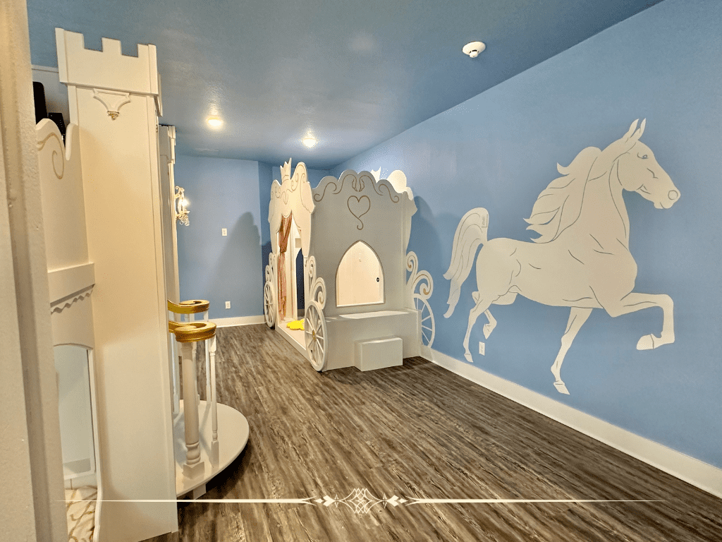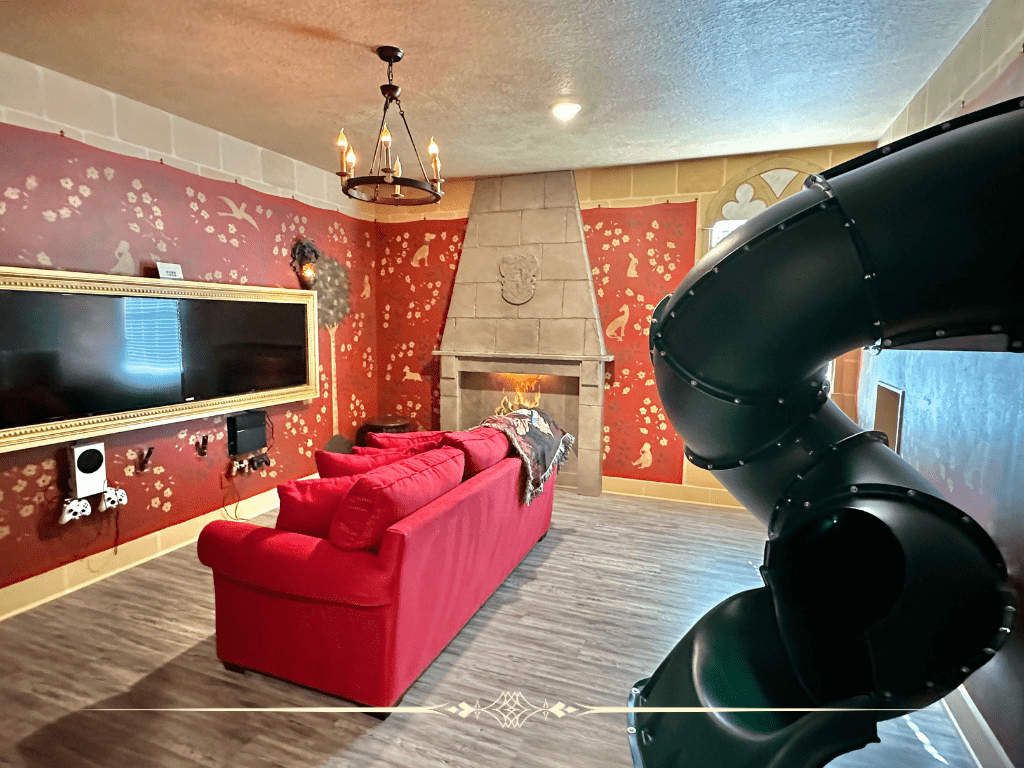 Imagine owning a nine-bedroom home just a stone’s throw from Disney, the heart of Florida’s magical charm. Each room in this house, including the ten and a half bathrooms, is designed with luxury in mind. The home features unique Harry Potter and princess-themed rooms, adding a touch of whimsy and fantasy, appealing to both kids and adults.