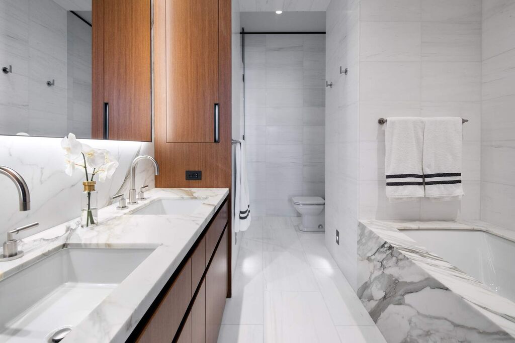 Madison House is a sought-after living destination designed by Handel Architects, with interiors by Gachot Studios. The 199 residences within the building, now the tallest in NoMad, start at 150 feet in the air and soar to 800+ feet at its angled pinnacle. This upscale condominium presents a double-height attended lobby and 30,000 square feet of hotel-style amenities. These include a spa with a 75-foot lap pool, cold plunge, hot tub, steam room, sauna, and treatment room; 2,800 square foot landscaped roof garden; double-height private lounge and bar; 14-seat dining room with a demonstration & catering kitchen; conference room; card & reading rooms; state-of-the-art fitness room; yoga room; and sports lounge with a golf simulator, billiards table, and children’s playroom.